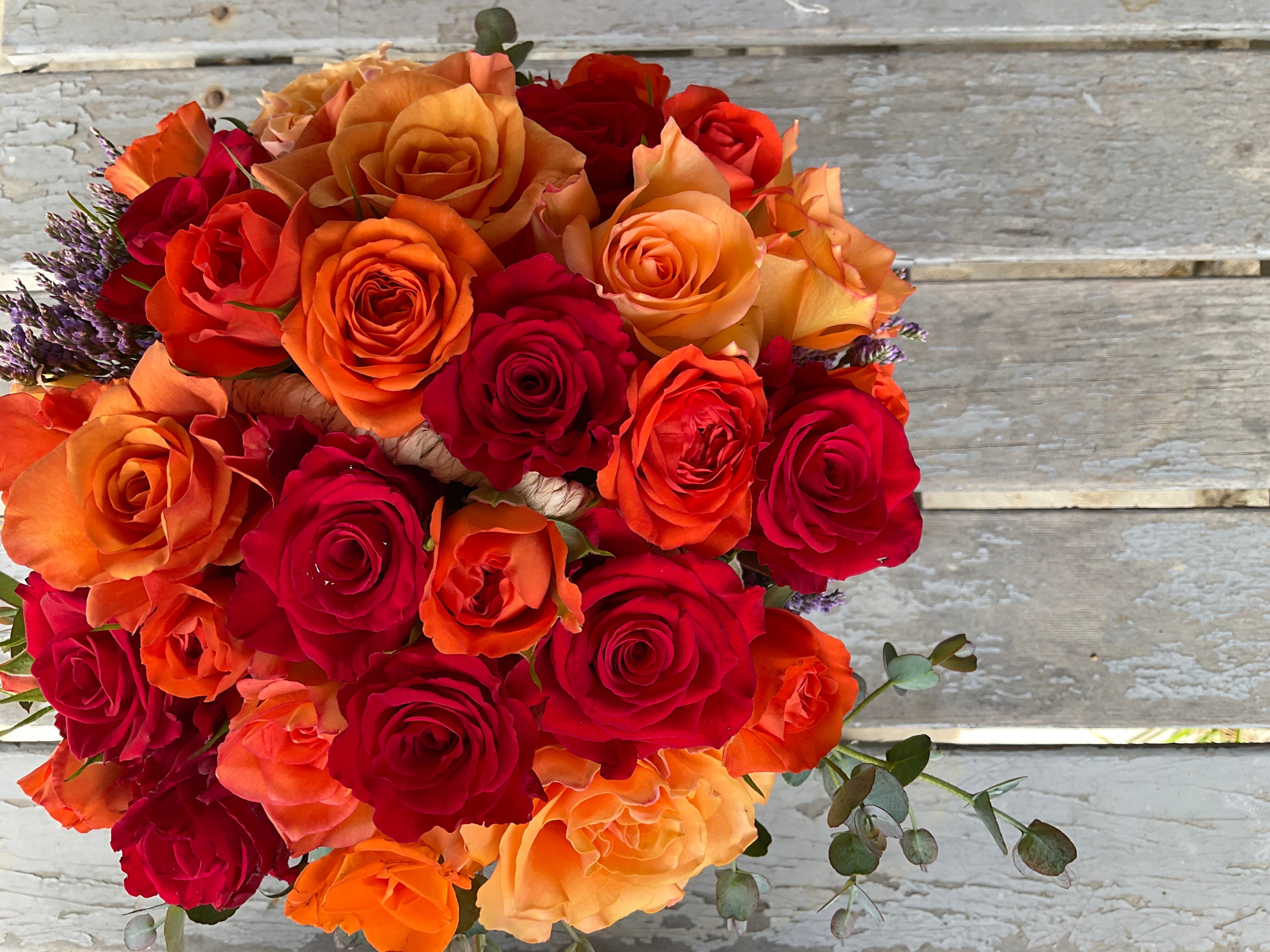 【プレゼント】花かごアレンジ_赤・オレンジ