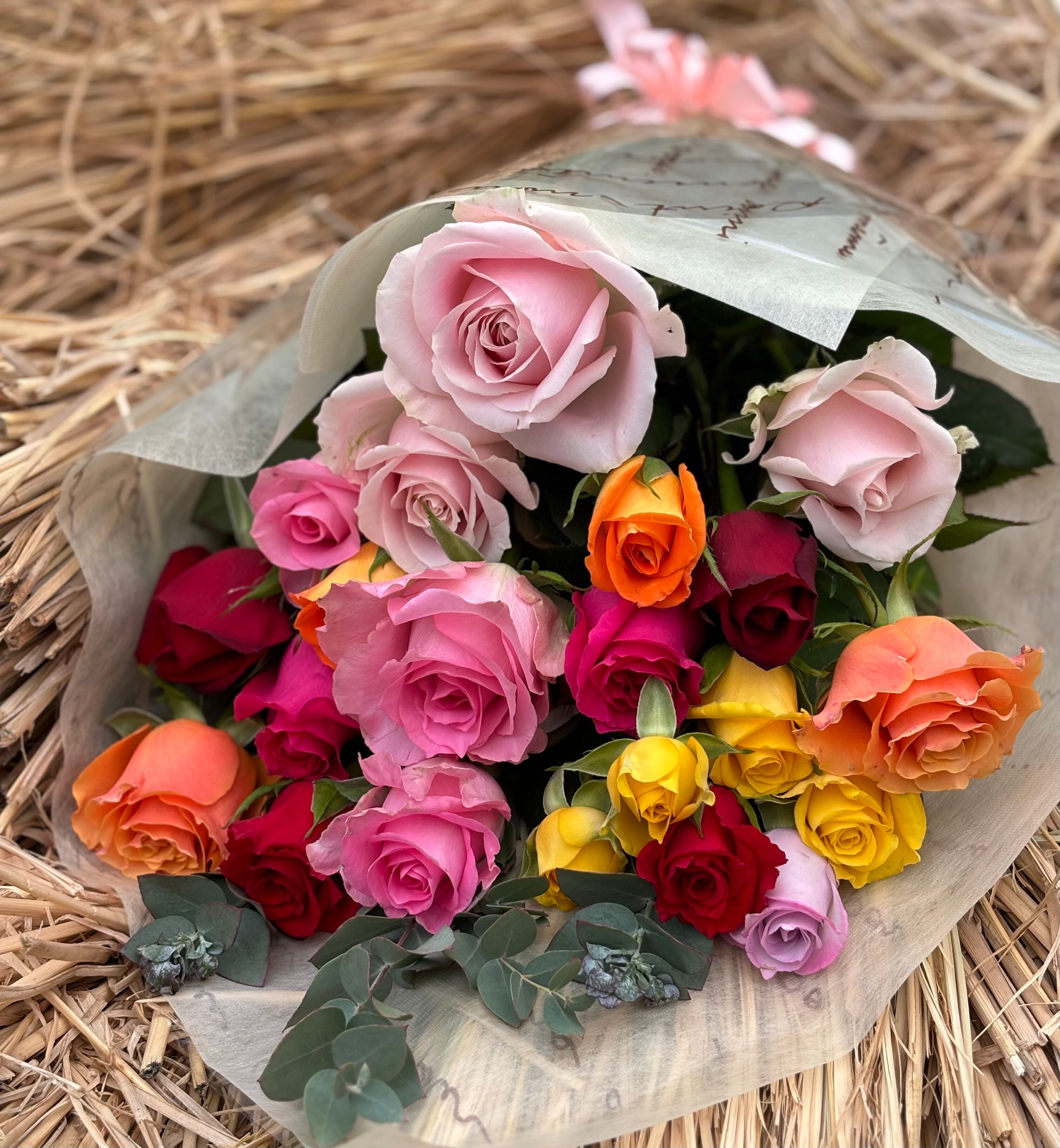 ご注文を頂いた時期の旬な品種のバラ25本とユーカリをMIXして花束を作っております。