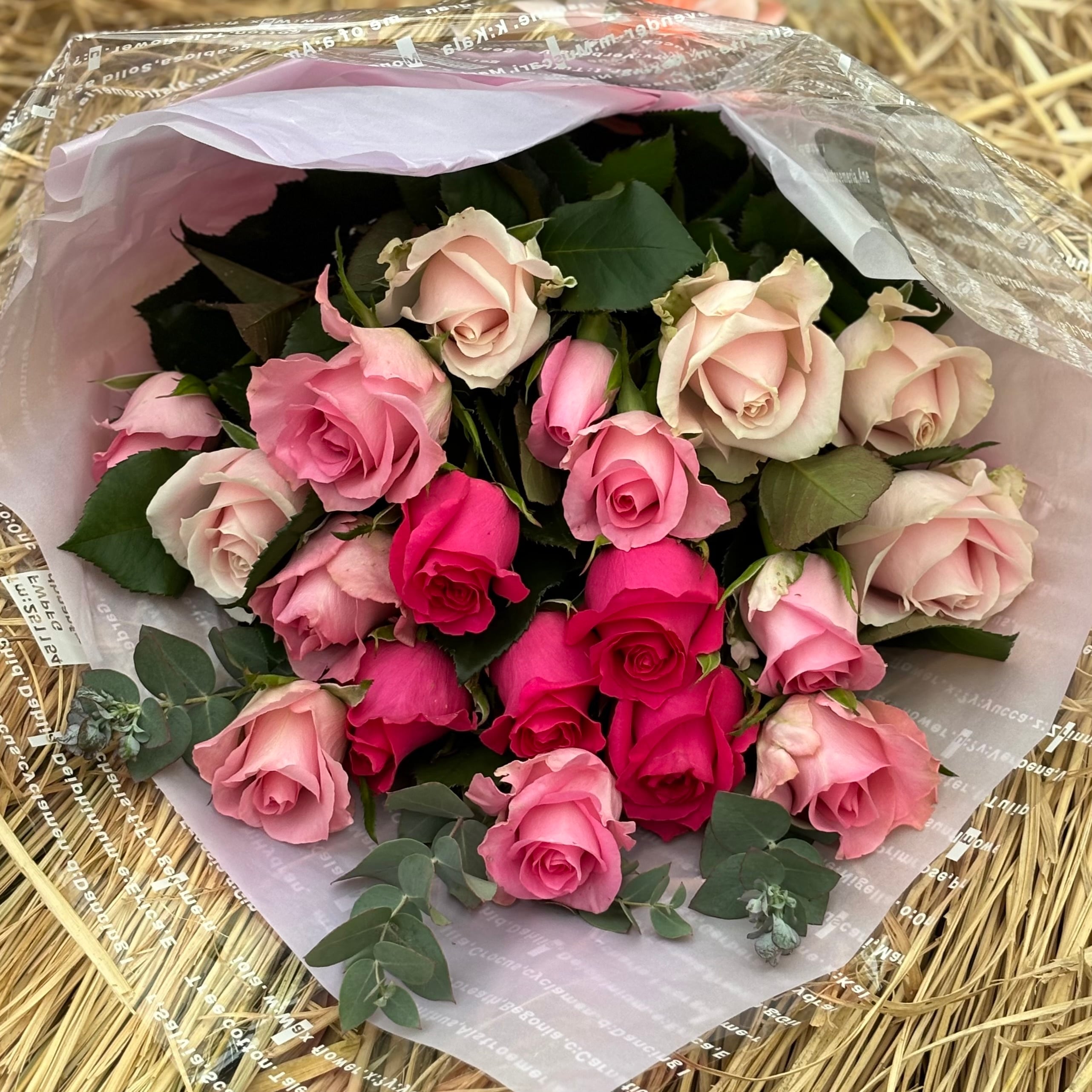 ピンクの濃淡をメインとして、旬のバラの品種をMIXした母の日用にラッピングした花束です。