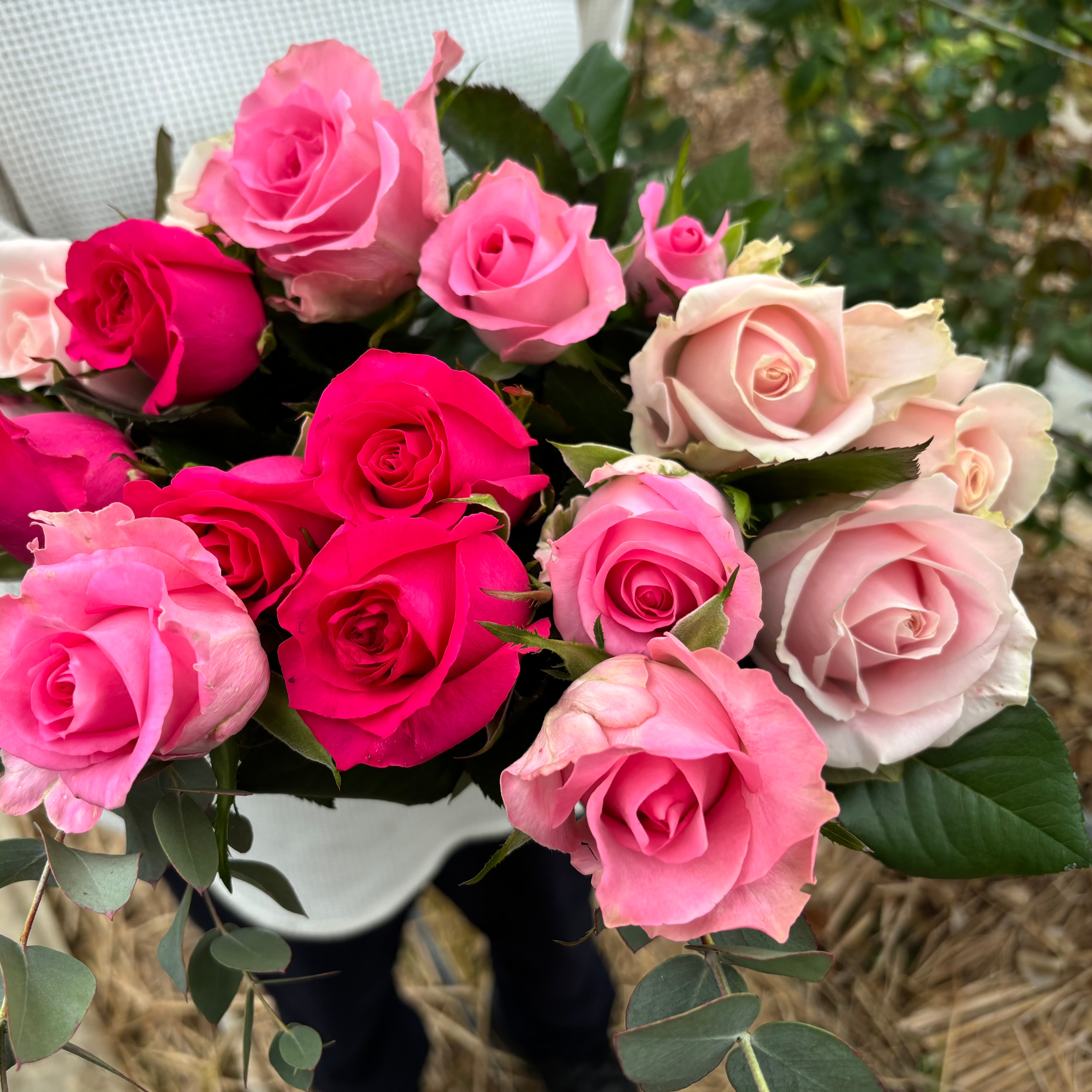 スペシャル花束(バラ25本とユーカリ、ラッピングあり)